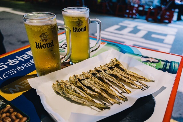 ここに来るお客さんがほぼ全員頼んでいたスケトウダラを干した「ノガリ」と、キンキンに冷えた生ビールを注文。ここでやっと、チキン&ビール「チメク」もできたし、ローカルな空気の中で、夜風を感じられるソウルのナイトスポットであった。