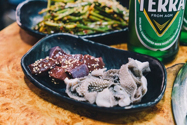 新鮮な牛ホルモンと、山盛りの野菜やきのこを豪快に鉄板焼きで提供してくれる。しかも、レバー&センマイ刺しが付きだしで出てくるなんて、ホルモン好きにはたまらない!