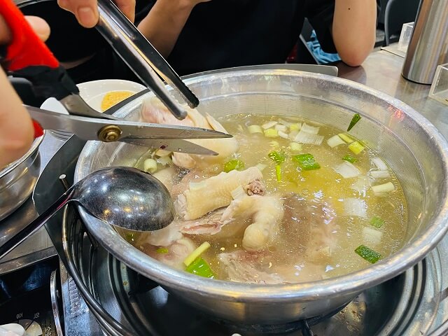 オーダーするとすぐに店員さんがやってきて、丸鶏を豪快にハサミでバツバツと切り分けてくれます。