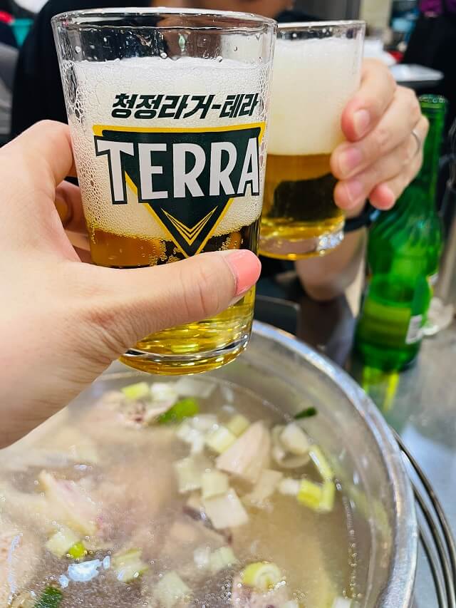 注文したのはタッカンマリ(鶏を一羽まるごとお鍋でグツグツ煮る料理)と瓶ビール。