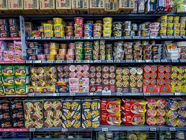それぞれ好みのカップラーメンをチョイスし、お惣菜コーナーではまたチキンやトッポッキもゲット。気になるお菓子やジュースは迷わずカートへ放り込み、お土産用にパックや韓国のり、ごま油なども追加。どれも「スーパー価格」なので手が止まりません。