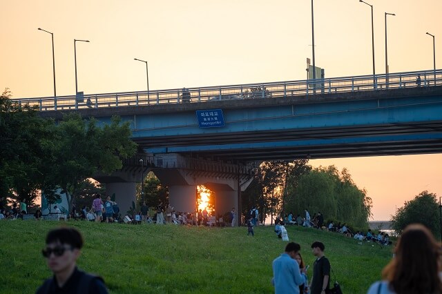 川辺には、何百何千という人たちがレジャーシートを並べ、ビール片手にチキンをつまみながら仲間と盛り上がっています。韓国ドラマでよく見るこの光景…!