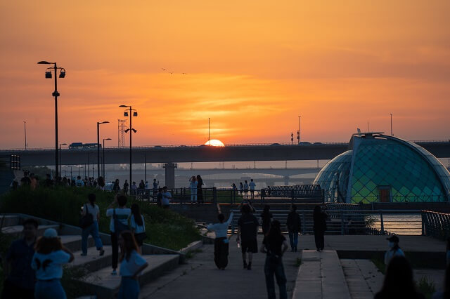 週末の夕涼みを楽しむ現地の皆さんに混ざりつつ、漢江に沈んでいく夕日を眺めてボーっとする。贅沢な時間でした。