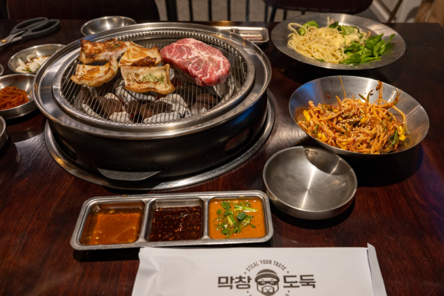 夕食はホテル近くの飲食店街へ。大邱は安くておいしいグルメが揃う街としても知られており、おいしいものがたくさん! 1食目に選んだのは韓国のホルモン焼き「マクチャン」。クチコミ評価の高かったお店「マクチャン トドゥク」を訪れました。