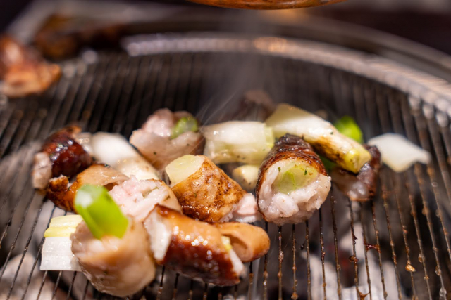 ぷりっぷりのホルモンをじっくりと炭焼き。ネギにホルモンを巻いた変わりダネも注文。程よく脂が落ち、プリッとジューシーに出来上がったマクチャンはアルコールとの相性抜群! ビールで乾杯して、ソジュ(焼酎)へと続きます。