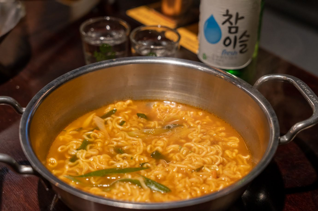 締めは韓国風ラーメン。韓国の飲食店では、メインを注文するとパンチャン(おかず)が無料でたくさんでてきますが、ここでは袋ラーメンも無料で提供。ラーメンを作る機械があるので、地元の人が作っているのを真似ながら調理。締めのラーメンってなんでこんなにおいしいんでしょう……。マクチャンにお酒にラーメンと大満足でした。