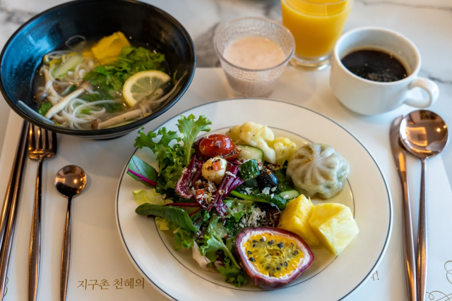 韓洋中と豊富なメニューが揃うブッフェ朝食。フォーを作ってくれるヌードルバーや、マンドゥなど点心系もあって、何を取ろうか悩んじゃう。個人的には野菜がたくさんあって嬉しかった。