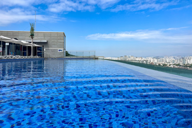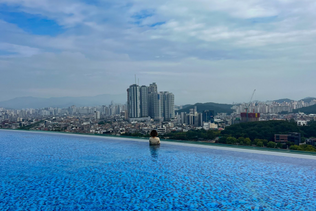 朝食のあとは、屋上にあるインフィニティープールへ! 108mもの長さがあり、目の前に大邱の街が広がります。