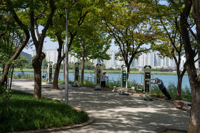 翌朝は朝食前にホテル目の前にある「スソン池」を散策。運動したり音楽を楽しんだりと、地元の人の憩いの場になっています。