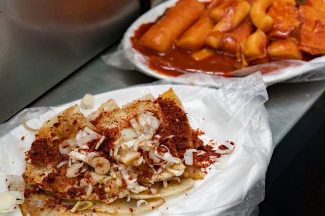 屋台がズラリと並ぶので、アジュンマ(おばちゃん)が元気なお店を選ぶのが、おいしい屋台にありつけるコツ。大邱名物のぺちゃんこ餃子とトッポギなどの軽食をメインに扱う屋台へ。ぺちゃんこ餃子は、半月型の薄い餃子の皮に春雨の具が入った餃子で、醤油や唐辛子の粉をかけて食べるローカルフード。もちもちした食感がおいしくてクセになります。