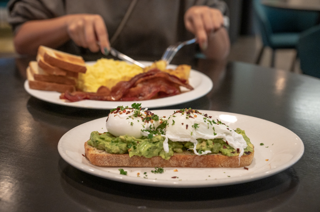 ホテルの一階で朝食から朝のスタート。とっても美味しくてボリューミー!