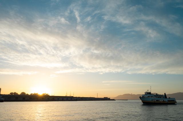海から、ゴールデンゲートブリッジと夕陽が重なって見えてとても幻想的な空間でした。