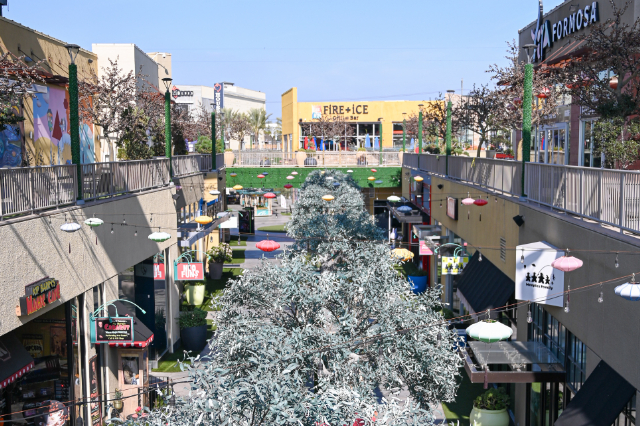 どことなくアジアな雰囲気のある場所に、鳥居のようなオブジェがある橋や、アジアンフードのお店が。
