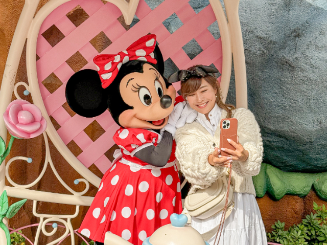 ミニーの家では、お庭で可愛いティーパーティーをしているミニーと一緒に写真を撮れたりも。