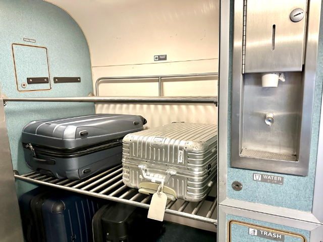 座席上以外に各フロアの隅にスーツケースのような大きな荷物を収納出来るスペースもあり、これは旅行客にとっても使いやすく便利でした。