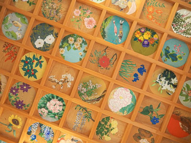 新緑の緑鮮やかな猪目窓と花と日本の風景が描かれた160枚の天井画が華やかにお出迎え!