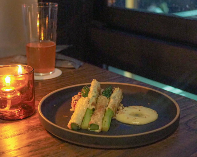○湯葉巻きグリーンアスパラガスのソテー レモン塩麹とキヌアサラダ