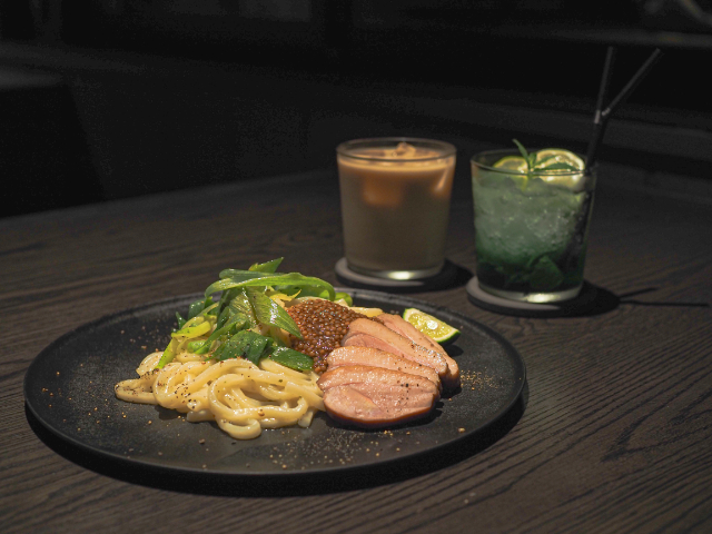 ○焦がしバターとマスタードのスモークうどん 〜鴨肉と九条葱〜