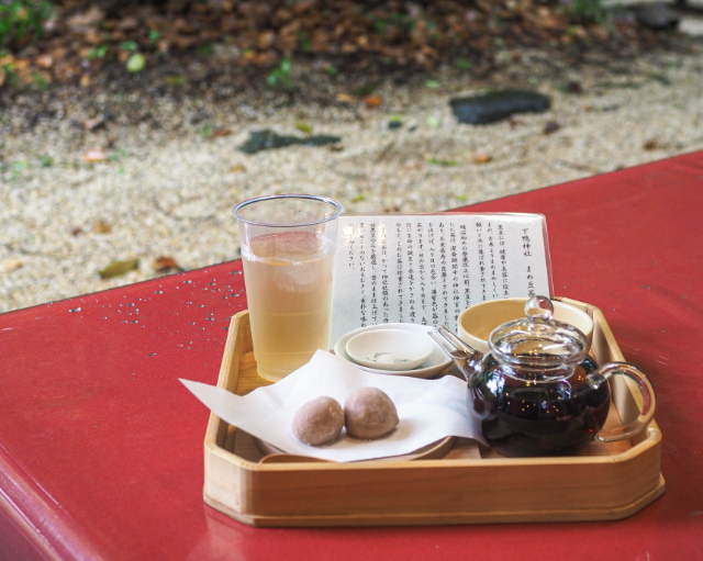 食べることで身体を清め、元気の気をいただき無事息災に過ごせるようにと、140年ぶりに復元した御餅と美容に嬉しい成分たっぷりの黒豆を使ったまめ豆茶で休憩。