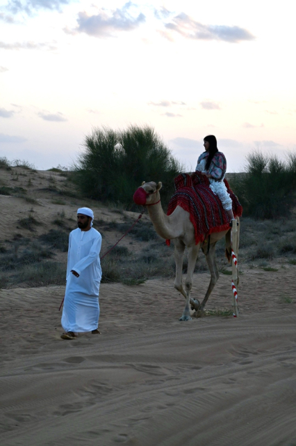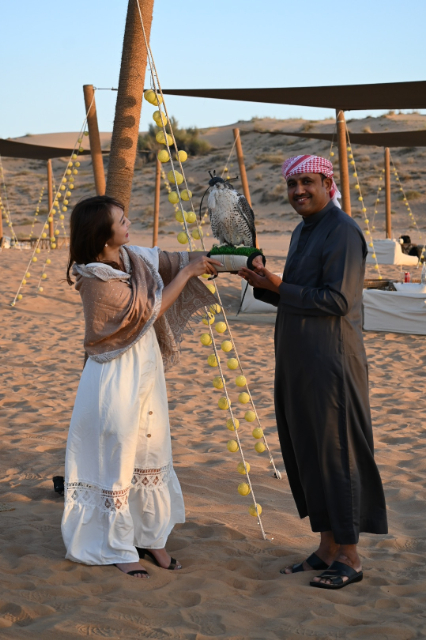 砂漠アクティビティもあり、手袋を装着し鷹を手に乗せる体験、ラクダに乗り体験、サンドボードの体験も無料でできます。