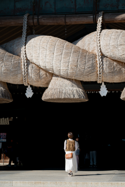 ここで必ず訪れたいのが、日本最大級の大注連縄が掲げられた神楽殿!