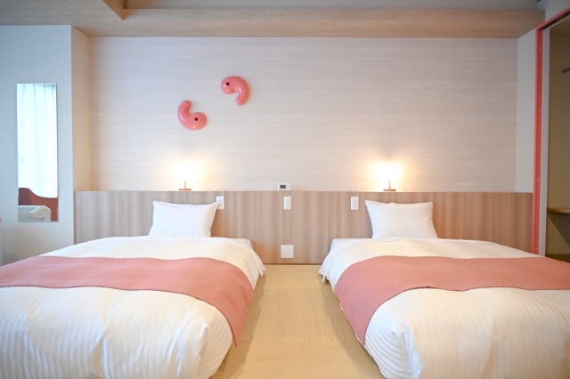 宿泊は、勾玉モチーフがかわいい『松乃湯』のレディースルームへ。